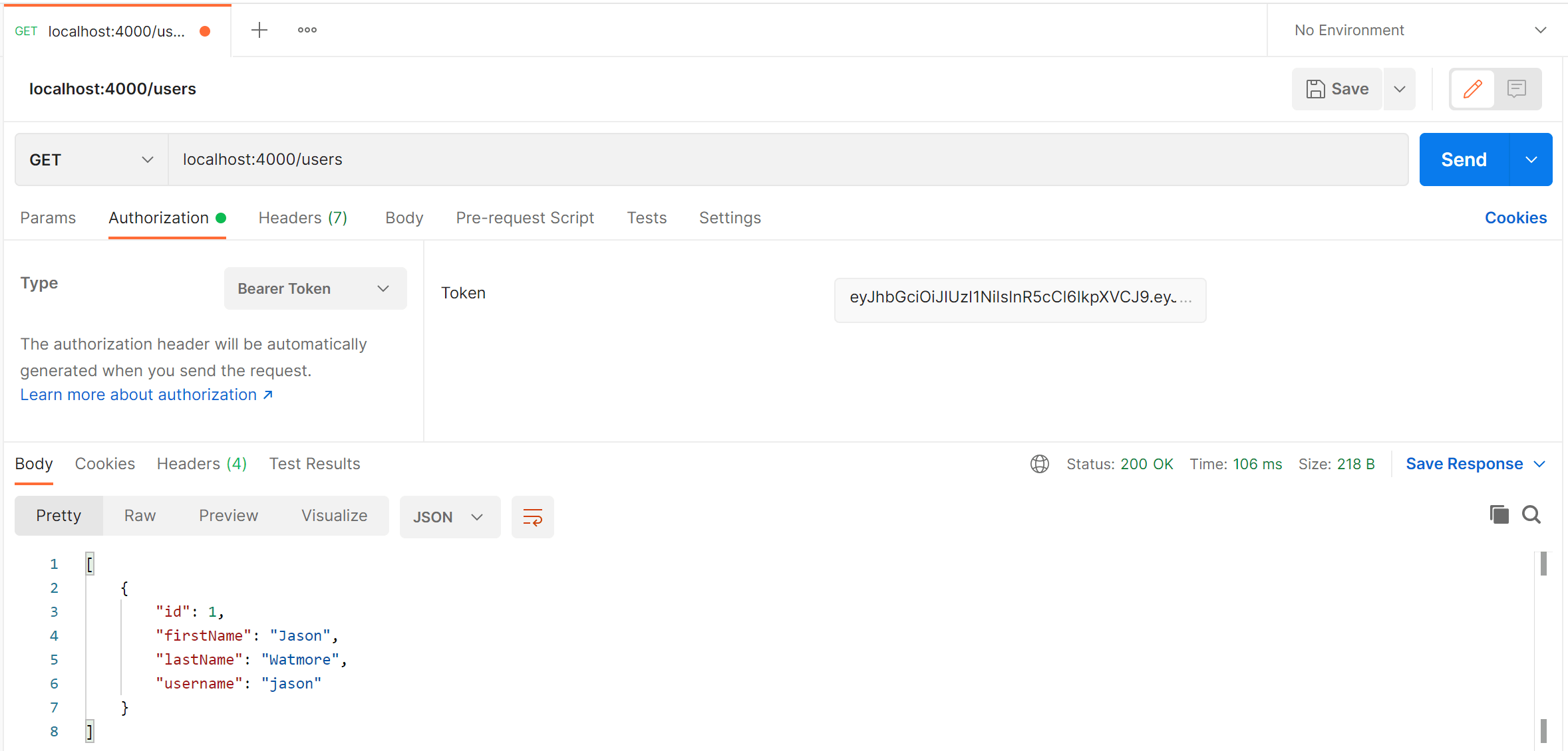 http://localhost:4000/users. - Select the Authorization tab below the URL field, change the type to Bearer Token in the type dropdown selector, and paste the JWT token from the previous authenticate step into the Token field.