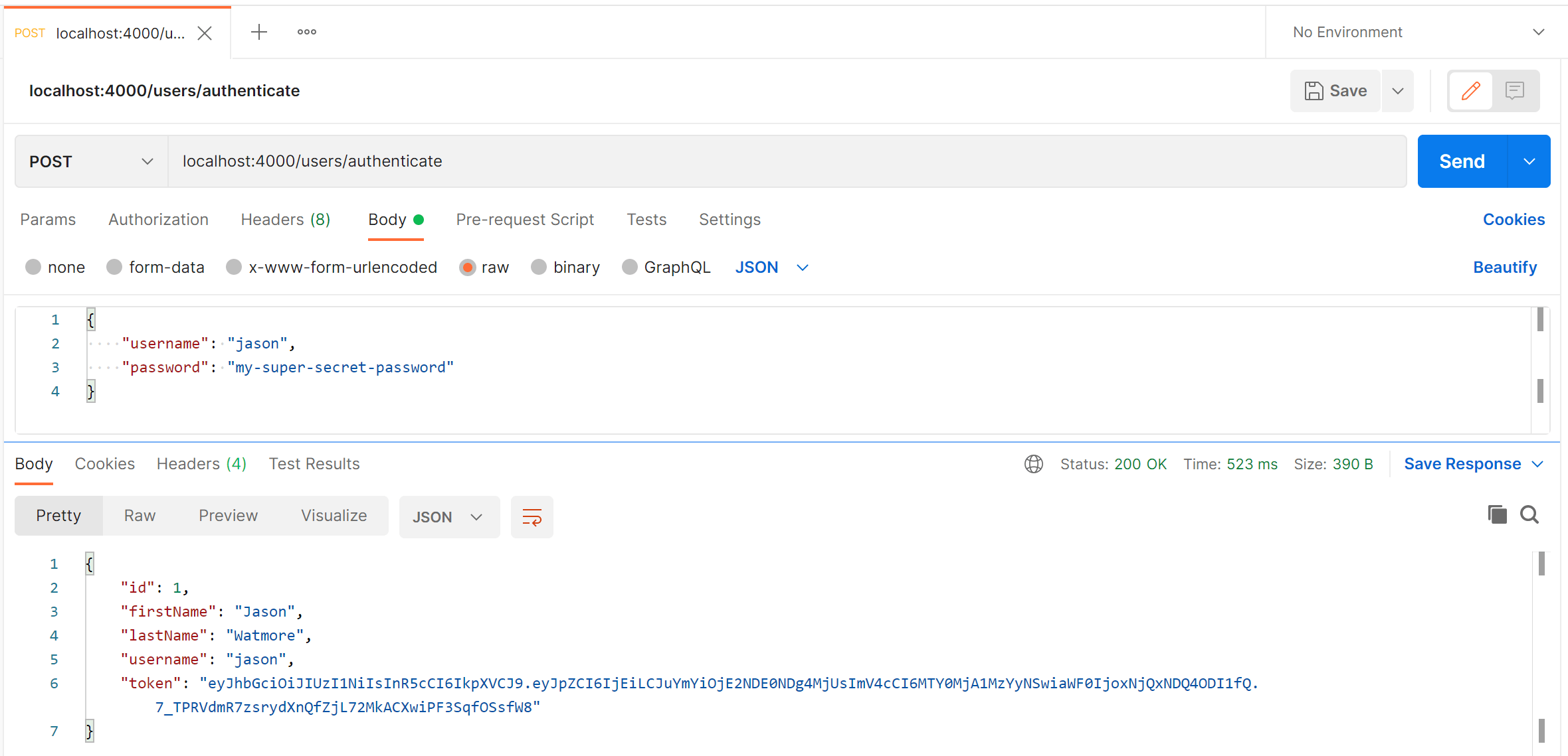 { "username": "jason", "password": "my-super-secret-password" } - Click the Send button, you should receive a "200 OK" response with the user details including a JWT token in the response body, make a copy of the token value because we'll be using it in the next step to make an authenticated request.