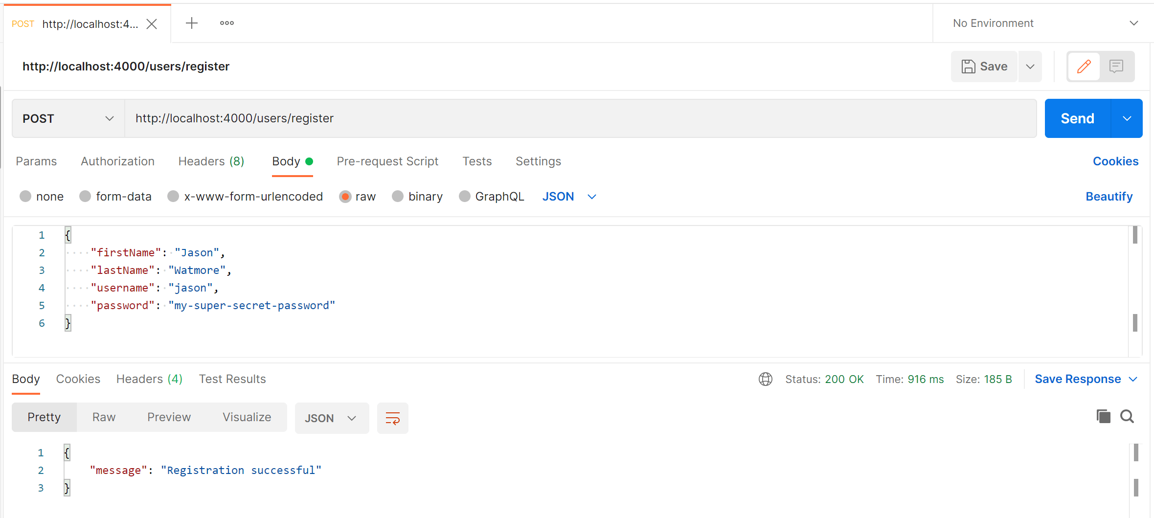 { "firstName": "Jason", "lastName": "Watmore", "username": "jason", "password": "my-super-secret-password" } - Click the Send button, you should receive a "200 OK" response with a "Registration successful" message.