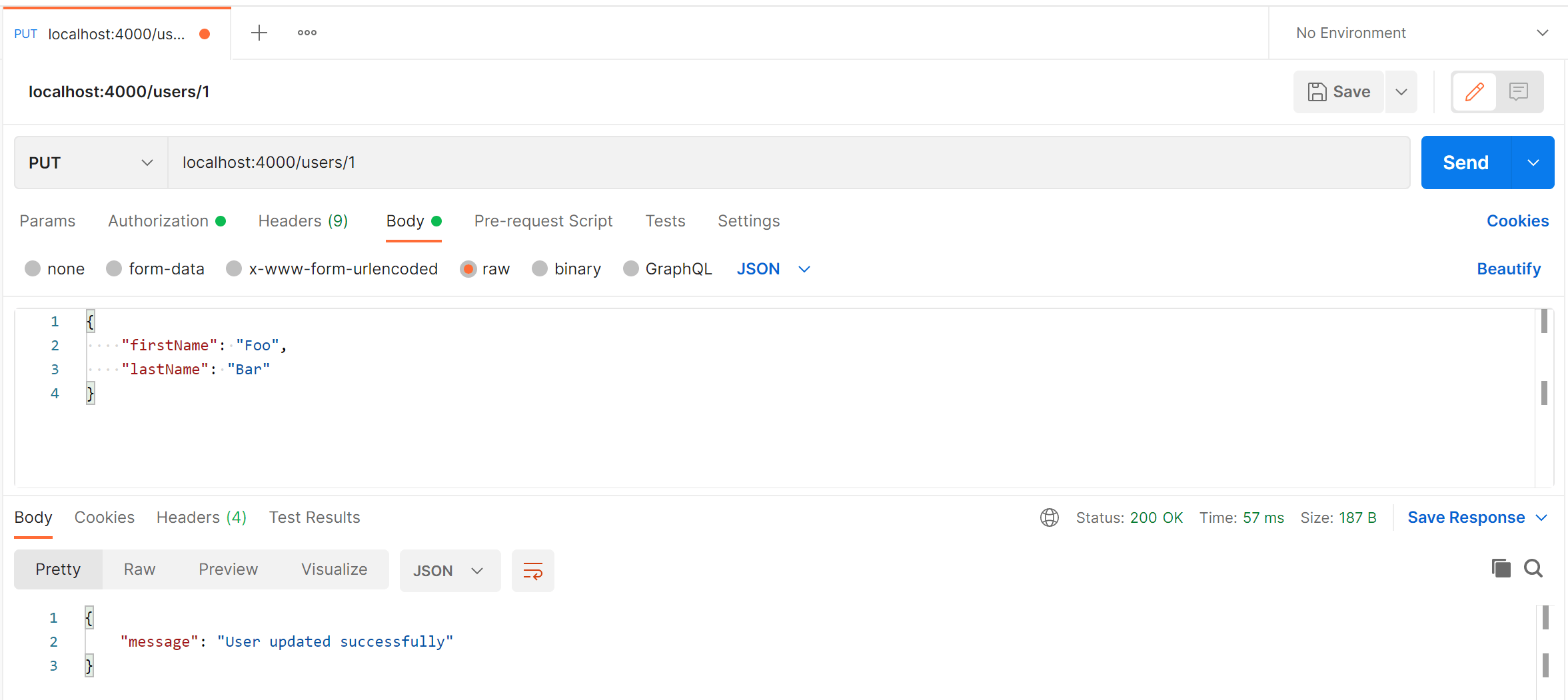 { "firstName": "Foo", "lastName": "Bar" } - Click the Send button, you should receive a "200 OK" response with the message "User updated successfully".